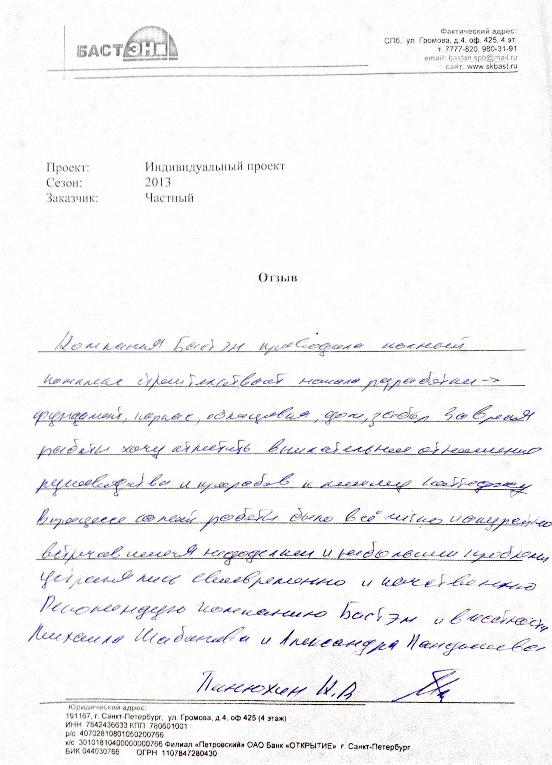 Компания «БАСТЭН» проводила полный комплекс строительства от начала разработки — > фундамент, каркас, облицовка , дом, забор. За время работы хочу отметить внимательное отношения рукодства и прорабов к моему коттеджу.