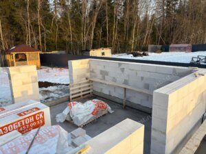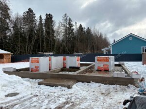 Строительство начали в конце прошлого года: выполнили подготовку участка и устройство монолитного плитного фундамента с ростверком. Сейчас возводим стены из газобетона.