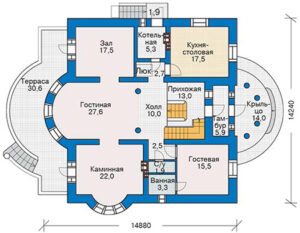 Проект дома №30-33 представляет собой двухэтажный жилой дом площадью 275 м2, выполненный в стиле русских дворянских усадеб XIX века. Главный вход дома украшен колоннами и ведет в просторную прихожую с трехмаршевой лестницей. От прихожей можно пройти в холл, а затем в большую гостиную представительского класса, откуда открывается прекрасный вид на сад через полукруглый эркер. На втором этаже расположены три спальни, кабинет библиотека и просторная общая комната. Дом обладает котельной лоджией и кухней-столовой, что делает его идеальным для большой семьи. Этот проект дома подойдет тем, кто ищет уютное и роскошное жилье с камином, комфортными спальнями и просторными общими помещениями. Площадь дома составляет 275 м2, что позволяет создать комфортное пространство для жизни и работы.