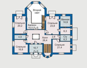 Второй этаж проекта представляет собой интимную зону, где расположены спальные и ванные комнаты. Все они доступны из просторного холла. Также из холла есть выход на балкон, с которого можно любоваться видом на гостиную.
