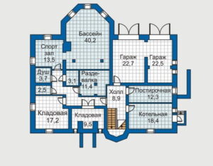Цокольный этаж дома разделен на две большие зоны. Одна из них предназначена для спортивных и оздоровительных активностей, а другая — для подсобных помещений и бытовых нужд.