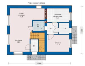 Представляем проект дома №33-17 — двухэтажный дом размером 11 на 8 метров с общей площадью 131 м2. Этот проект идеально подходит для тех, кто ищет небольшой и стильный коттедж.