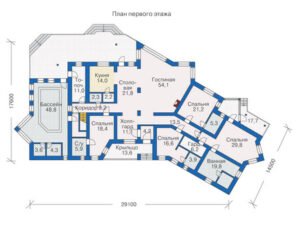Проект дома №35-54 представляет собой просторное здание с мансардой, общей площадью 519 м2. В этом доме вы найдете все, что нужно для комфортного проживания: бассейн, котельную и второй свет. Мансарда добавляет шарма и позволяет использовать пространство максимально эффективно. Дом имеет пять спален, что делает его идеальным для большой семьи или гостей. Площадь дома составляет 250 кв.м и больше, что обеспечивает достаточно места для всех. Проект дома №35-54 — идеальное решение для тех, кто ценит комфорт и функциональность.