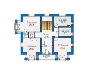 Этот проект отлично подходит для тех, кто ищет дом с кабинетом, пятью спальнями и площадью от 200 до 250 кв.м. Двухэтажная планировка обеспечивает пространство и удобство, а наличие террасы добавляет возможность наслаждаться свежим воздухом и красивыми видами. Камин создает атмосферу уюта и тепла.