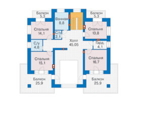 Представляем вам уникальный проект дома №41-26 — двухэтажного дома с общей площадью 265 м2. Этот просторный и комфортный дом имеет размеры 15 на 18 метров и включает в себя все необходимые удобства для вашей семьи.