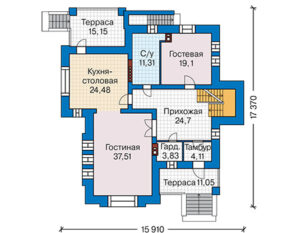 Особенностью этого проекта является наличие террасы, которая добавляет комфорта и позволяет насладиться свежим воздухом. Ее площадь составляет 26,4 квадратных метра, что позволит вам проводить время на открытом воздухе и наслаждаться прекрасными видами.
