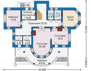 Представляем вам проект дома №43-21 — уникальное двухэтажное здание размером 20 на 17 метров, общей площадью 295 квадратных метров. Этот дом идеально подходит для больших семей или тех, кто ищет просторное жилье.