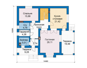 В доме предусмотрены все необходимые помещения для комфортного проживания. Особенностью этого проекта является наличие террасы, где вы сможете наслаждаться свежим воздухом и красивыми видами. Кроме того, в доме есть котельная, обеспечивающая комфортное отопление, а также кухня-столовая, где вы сможете готовить и проводить время с семьей и друзьями.