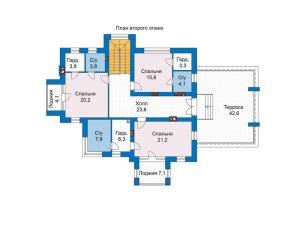 Этот проект дома идеально подходит для тех, кто ценит комфорт и функциональность. Дом оснащен всем необходимым для комфортной жизни, включая два гаража и кабинет. Двухэтажная планировка с террасой позволит вам наслаждаться прекрасными видами и проводить время с семьей и друзьями на свежем воздухе.