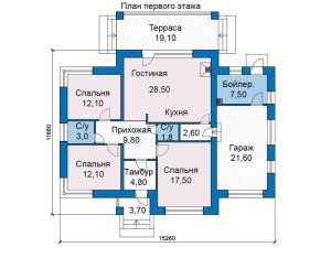 Представляем вам проект дома №48-87 — уникальное предложение для тех, кто ищет идеальное сочетание комфорта и функциональности. Этот одноэтажный дом имеет размеры 15 на 11 метров и общую площадь 120 квадратных метров. В его состав входят гараж, терраса, котельная и кухня-столовая. А еще есть терраса и крыльцо площадью 22,80 квадратных метра.
