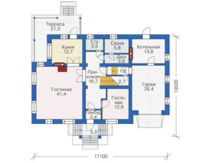 Представляем проект дома №55-58 — двухэтажный дом размером 17 на 13 метров, общей площадью 367 м2. Этот уютный дом включает в себя все необходимые удобства: гараж, террасу и котельную. Кроме того, в проекте предусмотрен погреб площадью 17 кв.м.