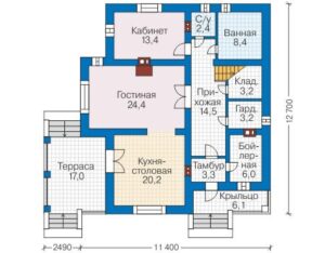 Особенностью этого дома является наличие кабинета, который станет отличным местом для работы или учебы. Также в проекте предусмотрены котельная и кухня-столовая, где можно собираться всей семьей.