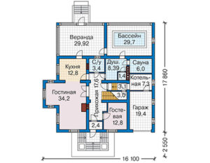В этом проекте предусмотрены гараж, бассейн, зимний сад, терраса, котельная и кухня-столовая. Гараж обеспечит удобное хранение автомобиля, а бассейн станет прекрасным местом для отдыха и занятий спортом. Зимний сад добавит уют и природную атмосферу в ваш дом, а терраса станет идеальным местом для отдыха на свежем воздухе.