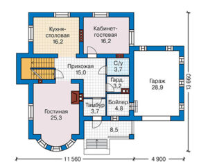 Проект дома №60-25 идеально подходит для тех, кто ищет просторное жилье с возможностью размещения большой семьи. Благодаря гаражу и цоколю, в этом доме есть место для хранения автомобиля и других вещей.