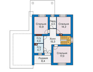 Основной акцент проекта — мансарда с террасой, которая добавляет дому изысканности и позволяет наслаждаться красивыми видами. Кроме того, в проекте предусмотрены гараж, терраса, котельная, лоджия и кухня-столовая, чтобы удовлетворить все потребности вашей семьи.