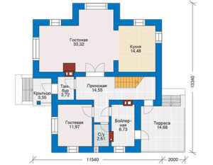 Особенностью этого проекта является наличие террасы, котельной и кухни-столовой. Также в доме есть терраса, крыльцо и балкон площадью 22,28 кв.м.