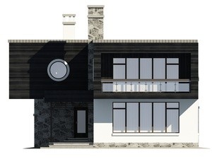 Дом имеет плоскую крышу и эркер, что придает ему особый шарм и индивидуальность.