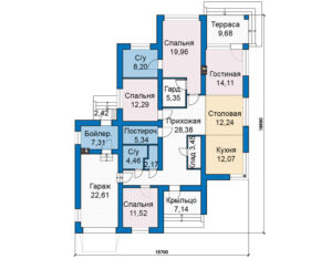 Представляем уникальный проект дома №69-63! Этот просторный одноэтажный дом имеет размеры 19 на 15 метров и общую площадь 169 квадратных метров. Включая гараж, террасу, котельную и кухню-столовую, а также два крыльца и террасу площадью 19,24 квадратных метра.