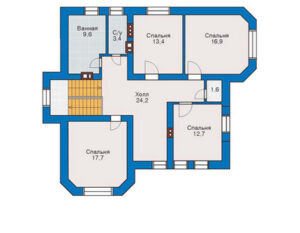 Проект дома №71-12 — это также двухэтажный дом с камином, который создает атмосферу уюта и тепла. Камин станет центром вечерних посиделок и семейных встреч.
