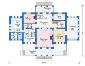 Представляем вам проект дома №81-00 — уникальный двухэтажный дом размером 26 на 19 метров, общей площадью 386 м2. Этот просторный дом идеально подойдет для большой семьи, ведь в нем есть все необходимое для комфортного проживания.