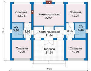 Представляем уникальный проект дома №81-09 — просторного одноэтажного дома размером 14 на 10 метров. Общая площадь этого уютного жилья составляет 102 квадратных метра. Но это еще не все! В проекте предусмотрена терраса и кухня-столовая, где вы сможете проводить время с семьей и друзьями. А еще есть дополнительная терраса площадью 21.54 квадратных метра, где можно наслаждаться свежим воздухом и красивыми видами.